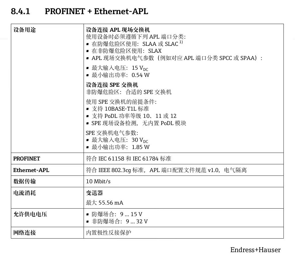 現(xiàn)在越來越多的儀表采用了Ethernet-APL技術(shù),用一對雙絞線同時實現(xiàn)以太網(wǎng)數(shù)據(jù)通信和電力傳輸,典型的如E+H公司的E300流量計、TMT86溫度變送器……等,這些儀表的特點是采用Ethernet-APL或單對以太網(wǎng)(SPE)接口+數(shù)據(jù)線供電(PoDL)技術(shù),通信協(xié)議為PROFINET,其相關(guān)技術(shù)參數(shù)如下圖所示: