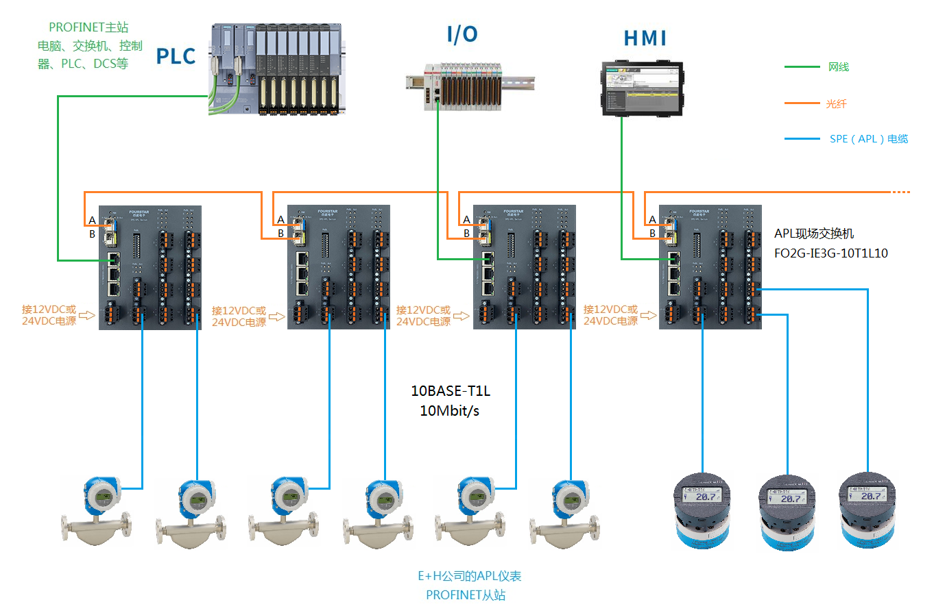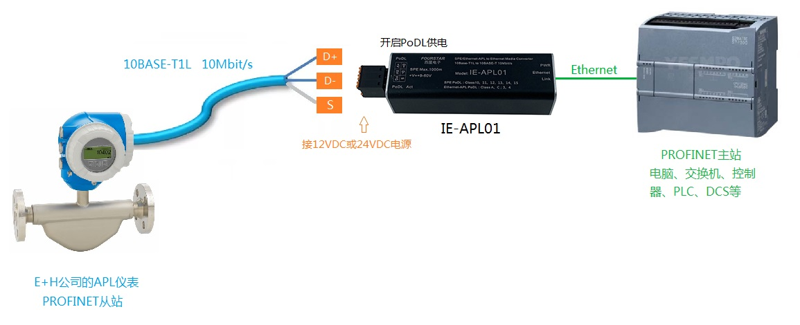 下面是E+H公司的APL儀表采用四星電子APL介質(zhì)轉(zhuǎn)換器和APL現(xiàn)場交換機(jī),連接上位PROFINET主站控制器(PLC、DCS等)的各種連接拓?fù)?,根?jù)APL儀表要求的數(shù)據(jù)線供電電壓來決定四星電子APL介質(zhì)轉(zhuǎn)換器和APL現(xiàn)場交換機(jī)的工作電源電壓采用12VDC或是24VDC。